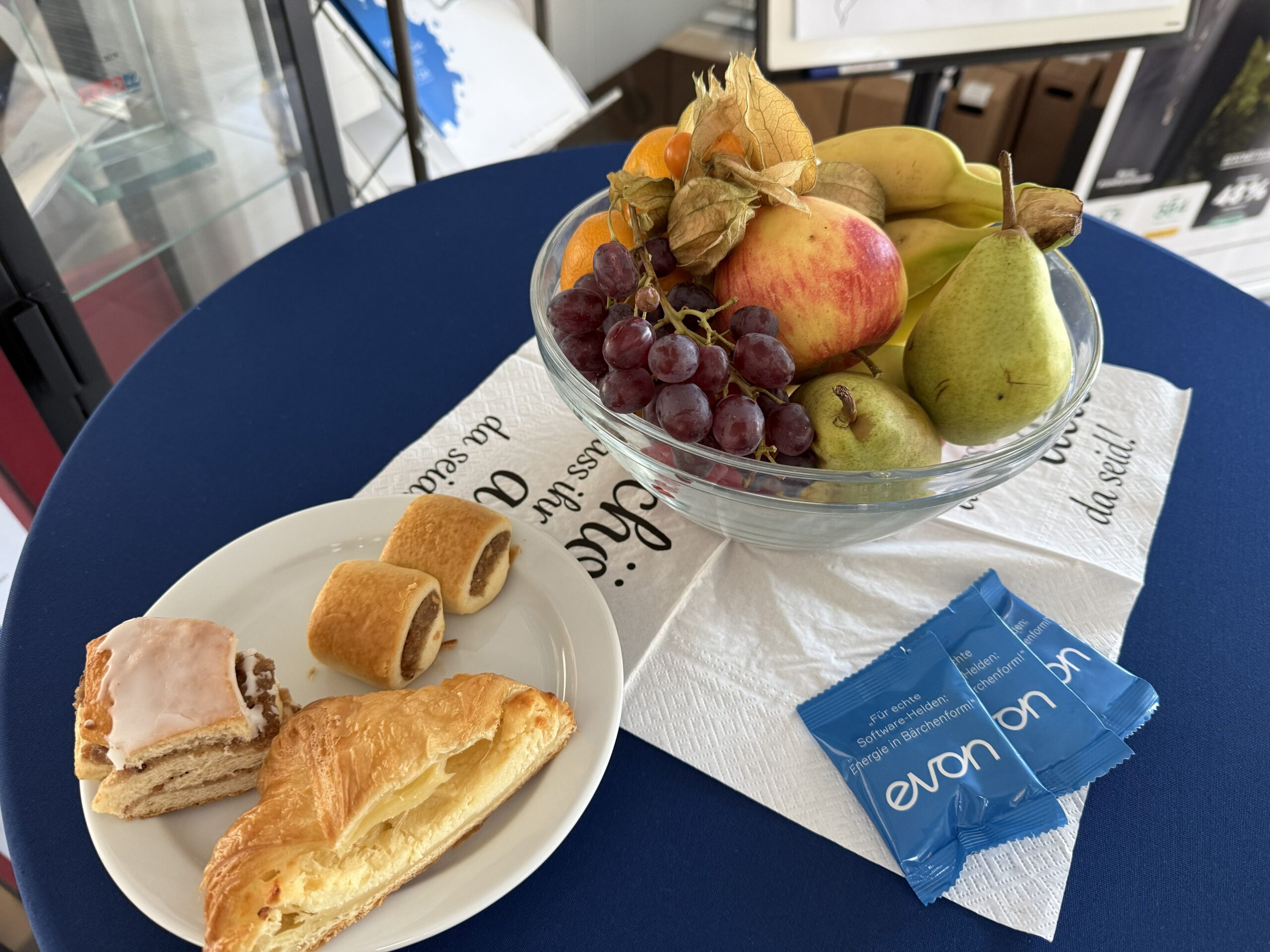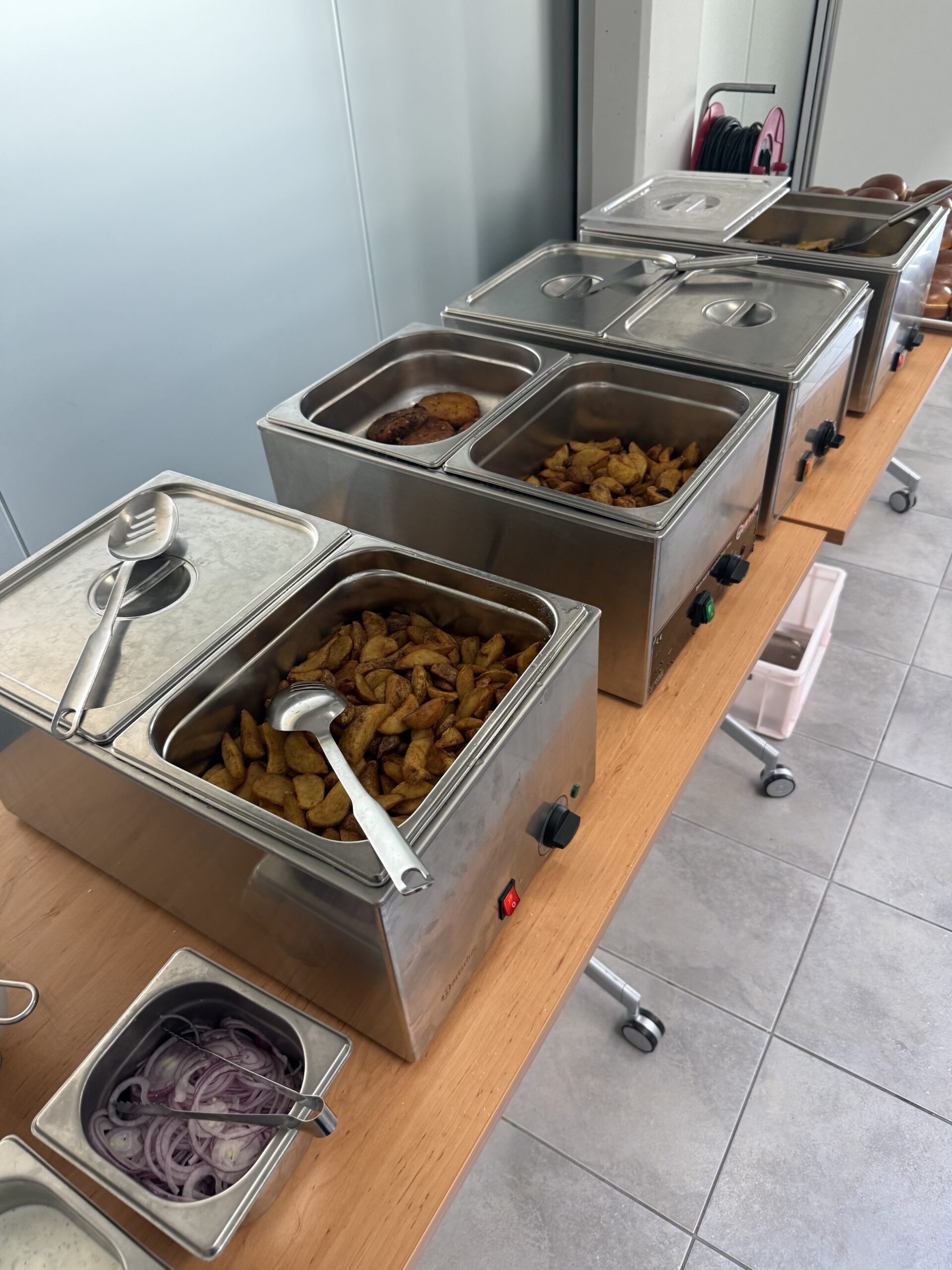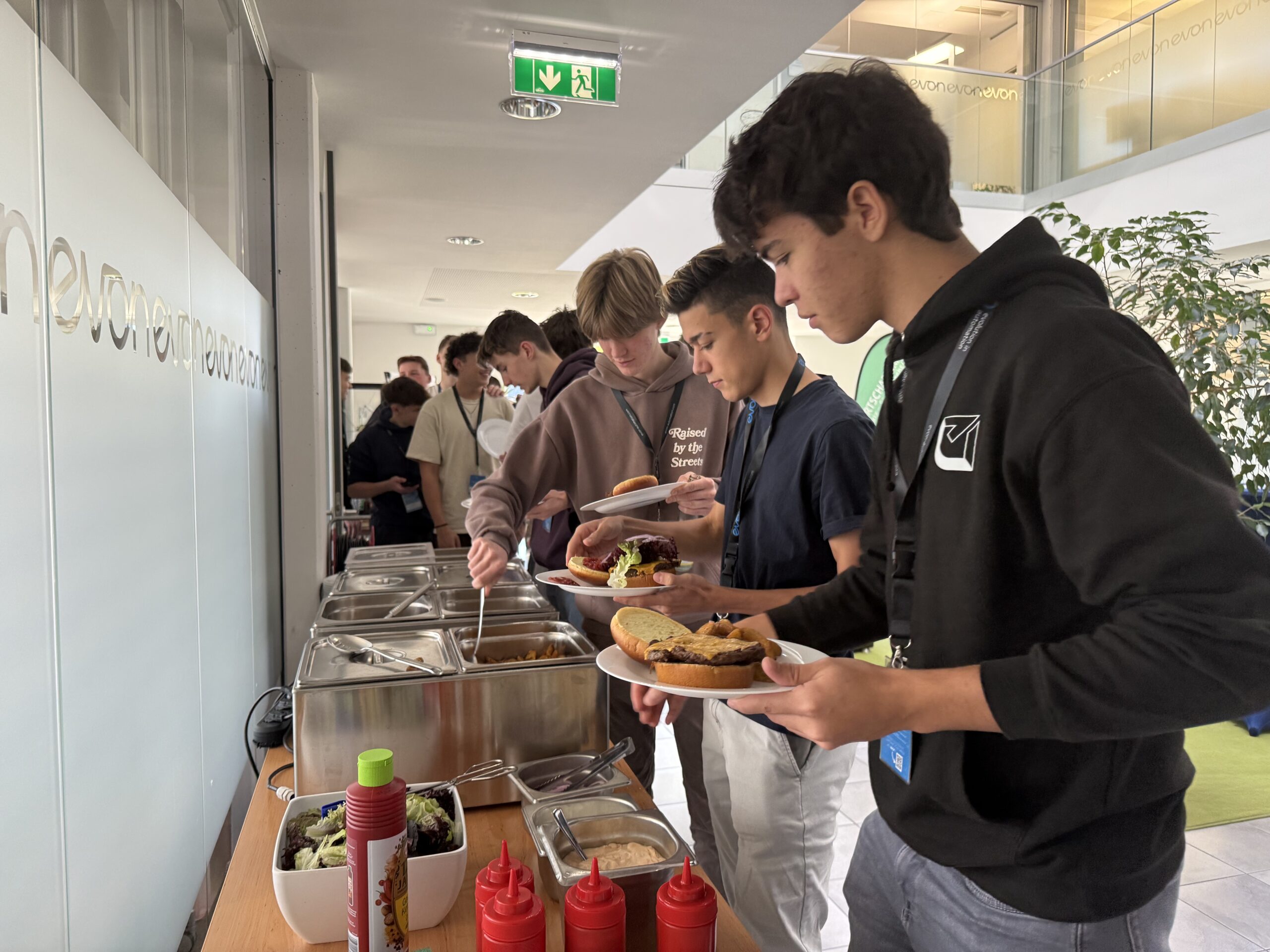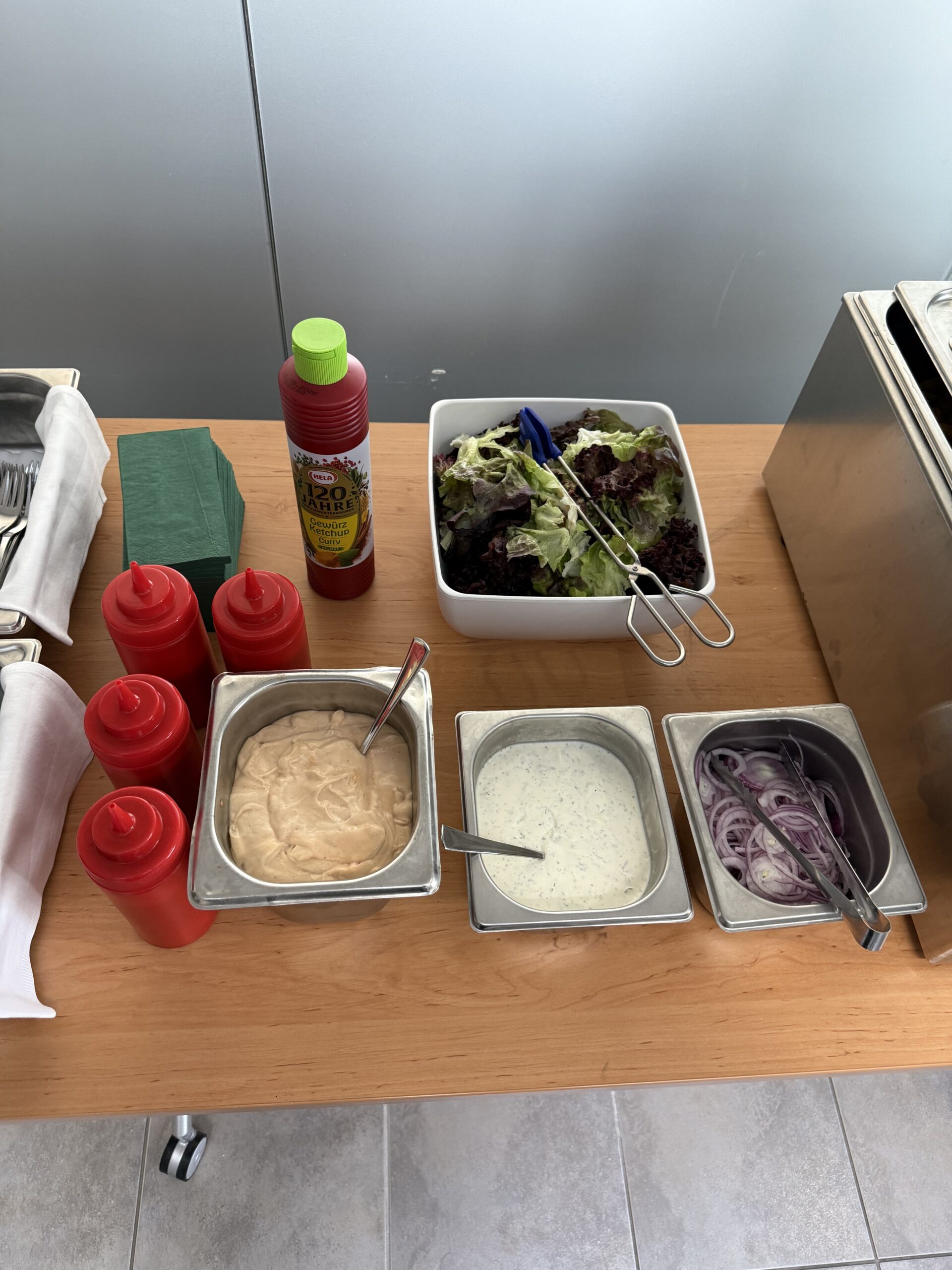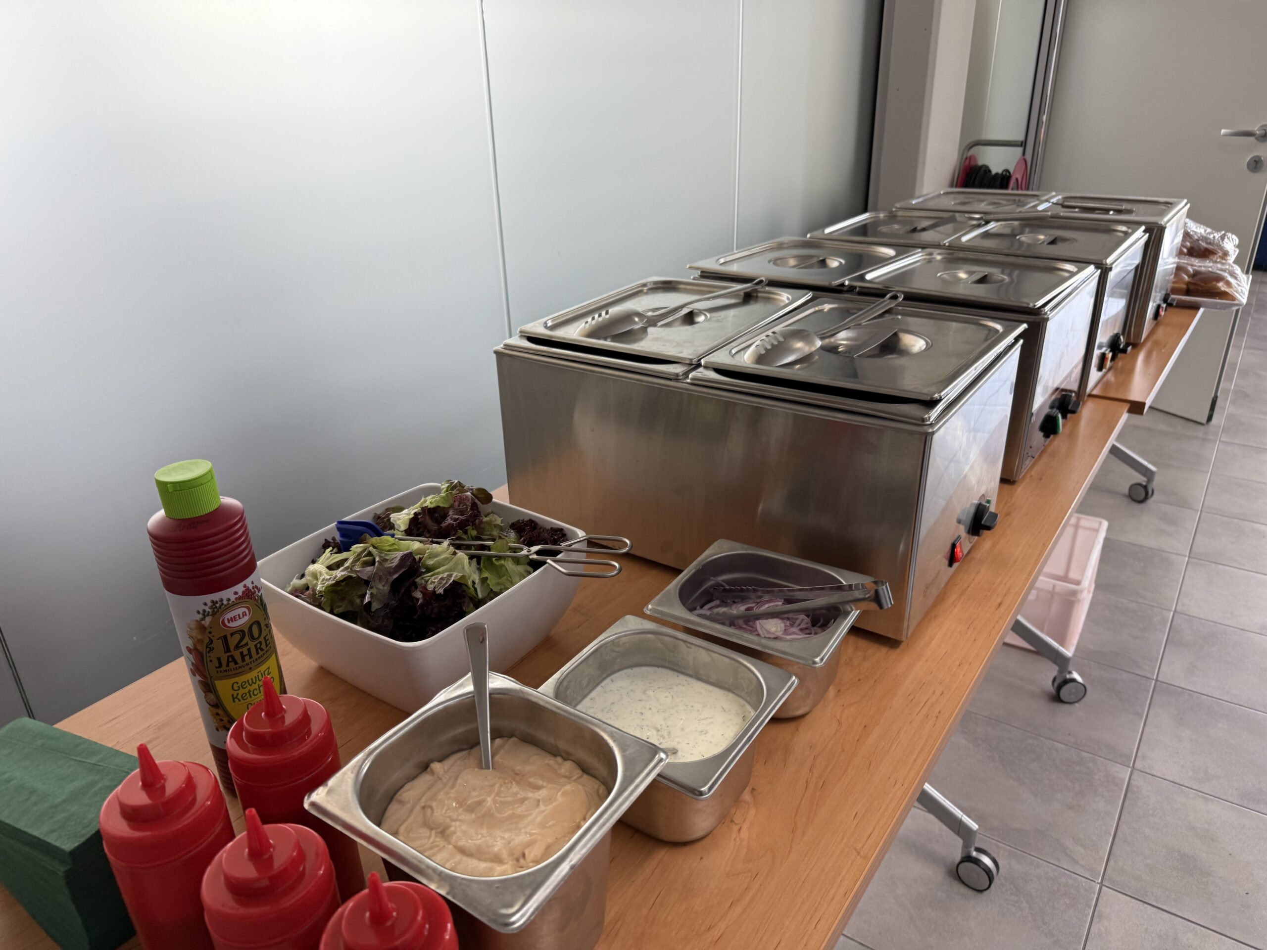 Programmieren macht hungrig. Deswegen werdet ihr zum Mittagessen mit köstlichen Burger versorgt-vegetarisch als auch mit Fleisch.